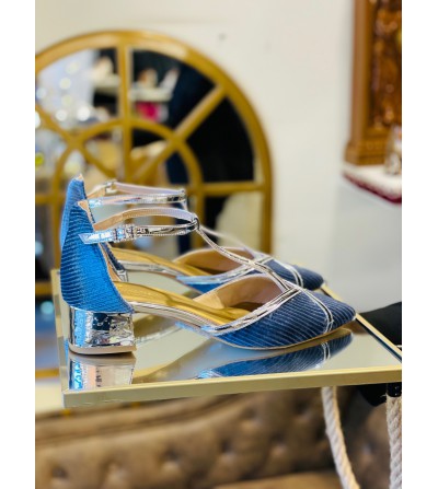 Zapato de salón de punta con tiras cruzando la pala, pulsera tobillera y tira sobre el empeine.